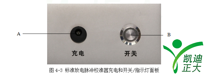 标准放电脉冲校准器内置锂电池,充电和开关/指示灯面板如图4-3所示: