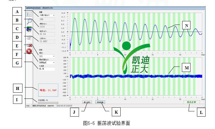K、数据保存按钮 L、高压单元状态 M、局放波形显示区域 N、振荡波电压波形显示