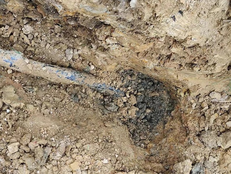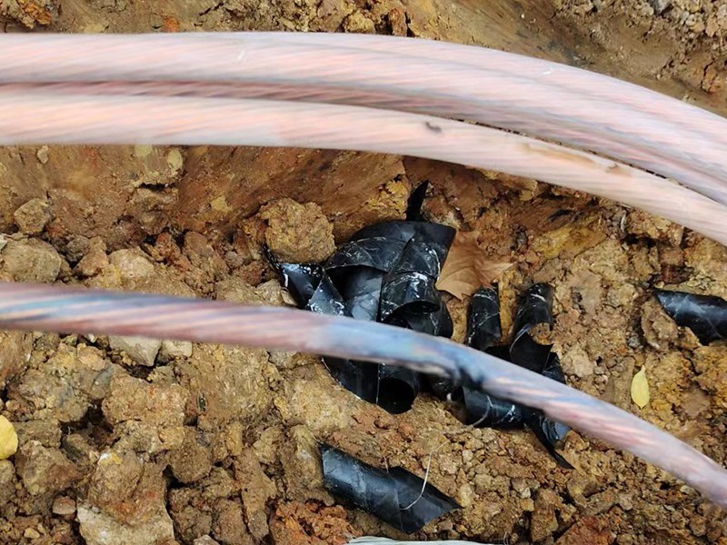 当挖开第一个故障点后,看见A零两相己经烧糊了。故障点己顺利找到。本以为只有一个故障点,但测绝缘后,C相阻值还是为零,接着往前找,测试故障距离64米,还用A字架定点,在60多米后确定故障位置后,挖开看见C相己明显烧糊。