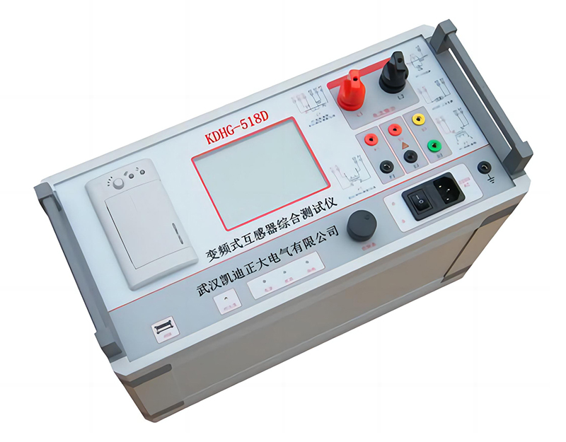 KDHG-518D变频式互感器特性综合测试仪是一种专门为测试互感器:PT、CT(保护类、计量类)、伏安特性(励磁特性)曲线、自动给出拐点值、自动给出5%和10%的误差曲线、变比测量、比差测量、相位(角差)测量、极性判断、一次通流测试、交流耐压测试、二次负荷测试、二次绕组测试、铁心退磁等设计的多功能现场试验仪器。实验时仅需设定测试电压/电流值,不需要设置步长、分段点等参数,设备便能够自动升压/升流,并将互感器的伏安特性曲线或变比、极性等实验结果快速显示出来,支持数据保存和现场打印,不但省去手动调压、人工记录、描曲线等繁琐劳动,还能通过USB接口将测试数据上传到电脑进行编辑保存或打印。操作简单方便,提高工作效率,是一种性价比较高的高科技产品。