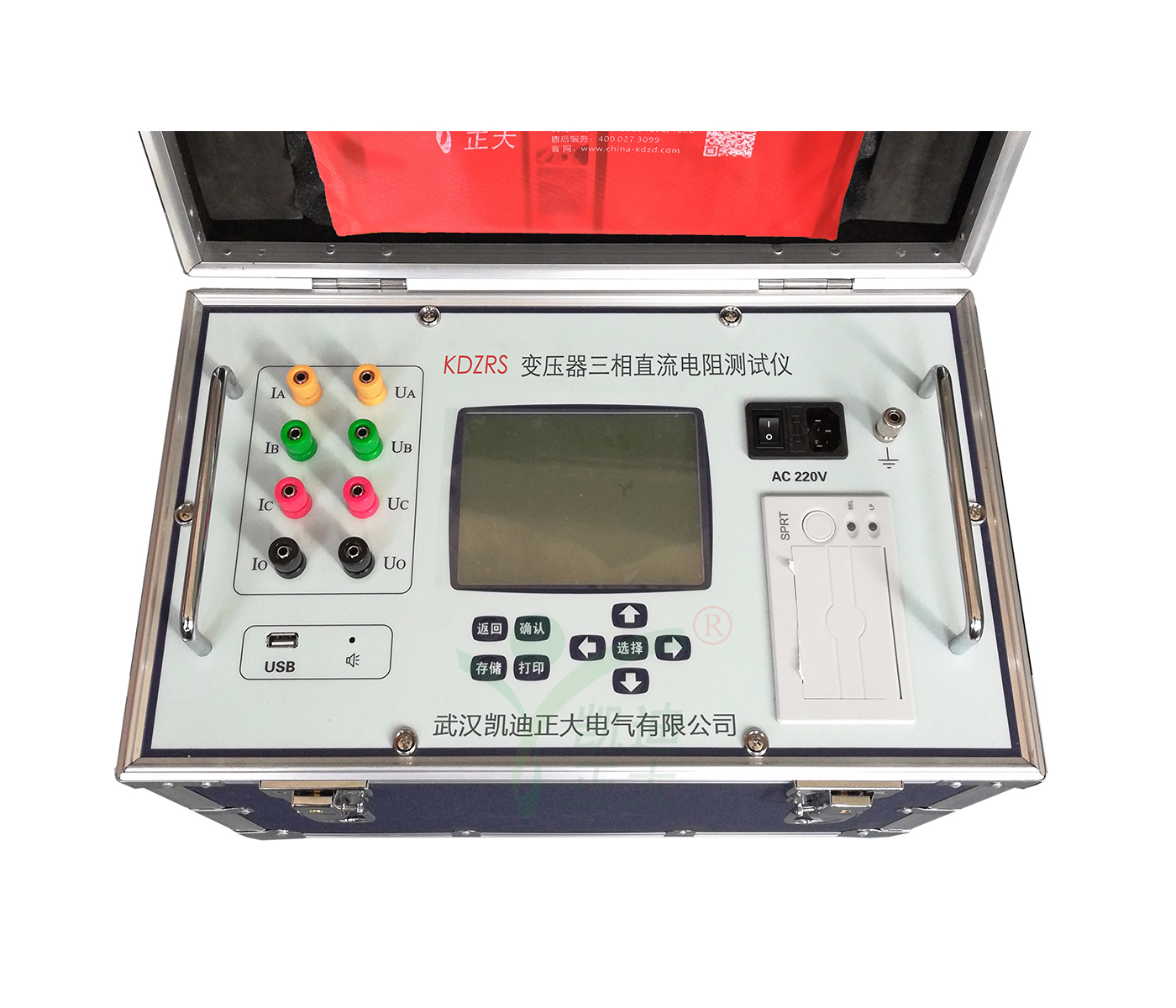 KDZRS-40A变压器三相直流电阻测试仪(三相同测40A)(以下简称直阻仪)是变压器直流电阻测量的新产品,是为测量大容量变压器三相绕组直流电阻而优化设计的。可对变压器的三相绕组直流电阻进行同时测试。采用双电源结构,对有分接的变压器YN联接绕组,实现三相同时加电,测量系统采用独立三通道电流采样、三通道电压采样,同时测量并显示三相电阻值和三相不平衡率。对有载调压变压器可以不需要放电,直接调节分接开关,大大缩短工作时间,解决了电力变压器各分接绕组直流电阻测试耗时长的问题测量时间是传统单相测量的三分之一。直阻仪采用大屏幕液晶显示器,中文图形界面,清晰直观,操作非常简单。并配备面板式打印机和大容量非易失性存储器,可以方便的存储和打印测量结果。测试数据稳定,快速,重复性好。