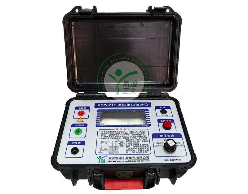 KD2671C绝缘电阻测试仪由中大规模集成电路组成。本表输出功率大,短路电流值高,输出电压等级多(有四个电压等级)。工作原理为由机内电池作为电源经DC/DC变换产生的直流高压由E极出经被测试品到达L极,从而产生一个从E到L极的电流,经过I/V变换经除法器完成运算直接将被测的绝缘电阻值由LCD显示出来。