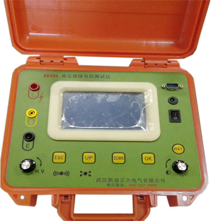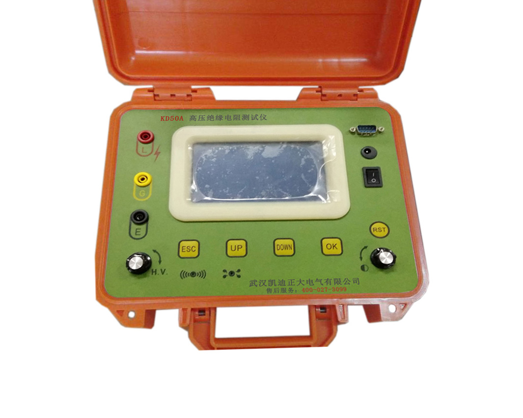 KD50A高压绝缘电阻测试仪,具有5个量程:250V,500V, 1000V, 2500V, 5000V,测试可达5TΩ。容量大、抗干扰强、液晶屏同步显示、交直流两用、操作简单、自动计算各种绝缘指标、吸收比、极化指数、各种测量结果具有防掉电功能等特点。是测量大容量变压器、互感器、发电机、高压电动机、电力电容、电力电缆、避雷器等绝缘电阻的常用测试仪器。