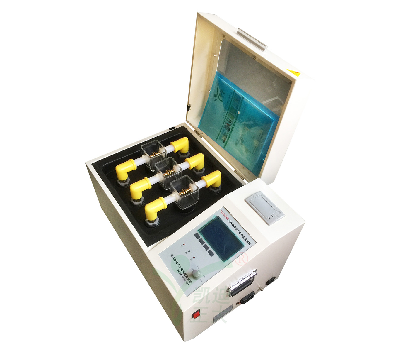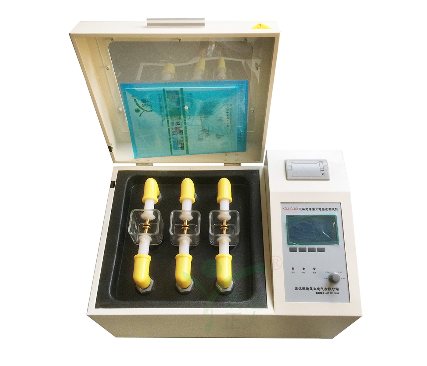 KDJJC-80 自动绝缘油介电强度测试仪(三杯同测)具有数据处理功能:可记忆以往的500次测试结果,用户自定义四套标准检验程序,您可以根据工作需要选择一个标准的检验程序对试样进行测试。由于我公司使用的是“SLX 试杯”结构,可通过调整试杯两侧的旋动机构来微调电极间距,不但调整方便,而且精度很高。用户在调整电极间距时,“方便”、“准确”、“快捷”。